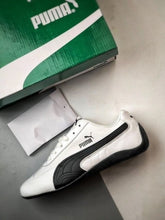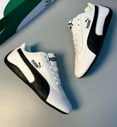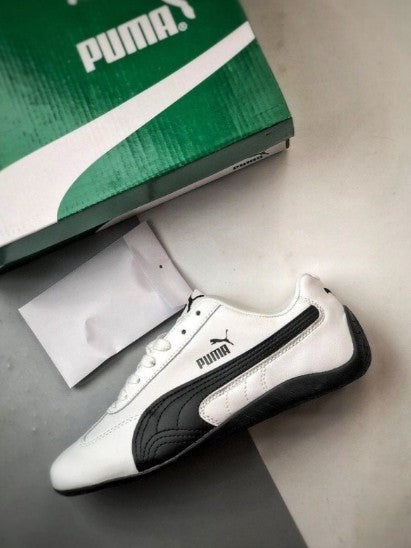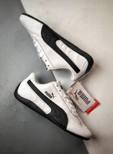 The Puma Speedcat OG Shield White is a sleek, low-profile sneaker that blends motorsport heritage with modern streetwear style. Originally designed as a fireproof racing shoe for Formula 1 drivers, it features a premium white leather upper, black suede accents, and the iconic Puma Formstrip on the sides. The shoe has a cushioned footbed for comfort, a rubber outsole for durability and grip, and embroidered branding on the tongue and heel. Versatile and stylish, it’s perfect for casual wear, motorsport events, or everyday fashion, making it a standout choice for those who value both performance and design.