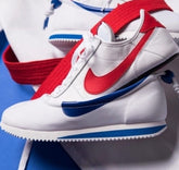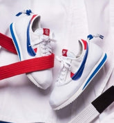 The Nik-e Clot x Cortez “Clotez” White Game Royal is a bold reimagination of the classic Cortez silhouette, blending heritage with innovation. Inspired by Bruce Lee’s kung fu shoe aesthetics, this unique design functions as a 2-in-1 sneaker. The outer layer, dressed in crisp white leather with Game Royal and Black detailing, can be worn as a slip-on, while the inner shoe features a sleek Cortez build with a lightweight, sock-like construction.