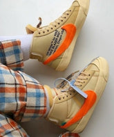 The Nik-e Blazer Mid x Off Whit-e “All Hallow’s Eve” is a standout from Virgil Abloh’s “Spooky Pack”, released in 2018. Dressed in a creamy vanilla upper with striking orange Swooshes, the sneaker takes inspiration from classic Halloween vibes. The suede and leather mix gives it a premium yet vintage touch, while the exposed foam tongue, signature zip tie, and Helvetica text branding add Off Whit-e’s unmistakable deconstructed aesthetic. Subtle beige overlays and tonal midsole balance the bold orange detailing, making it a unique blend of minimalism and statement design.
