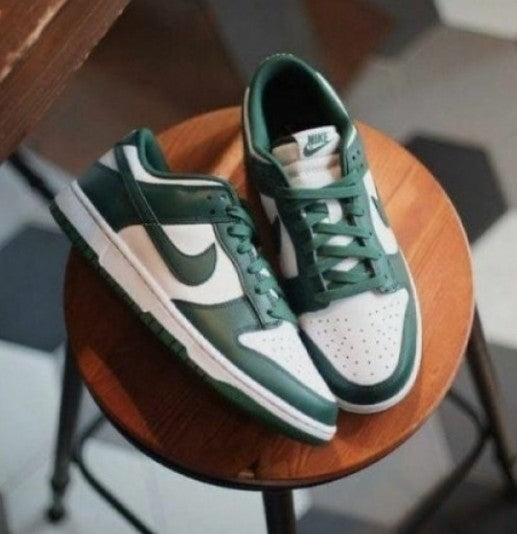 The Nik-e SB Dunk Low Varsity Green blends timeless style with skate-ready performance. Featuring a premium white leather base accented by bold varsity green overlays and swoosh, this pair delivers a clean, sporty look that stands out on and off the board. The padded tongue and collar ensure lasting comfort, while the responsive midsole and grippy rubber outsole provide reliable support and traction. A classic two-tone design, it’s a must-have for sneaker enthusiasts and SB collectors alike.